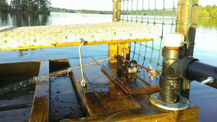 | The "ready" position. The steel rod is connected to the rotating target with some cable. That is attached to a bolt eye (round circle at end of a bolt) on the ABS pipe about 3 inches from its pivot point (the eye is not visible). If you wanted to set up the dunker to trigger conterclockwise the eye bolt would be reversed - so the eye is located on the opposite side of the target shaft. This would be how a traditional dunk tank is set up with the dunker facing the dunkee. |