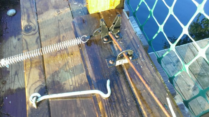 This is not in the ready position. The gate latch has to be rotated back towards the green fencing and then the steel rod goes through the hole in the gate latch to hold it in place.