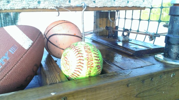| This is the "ready" position. The master link which is attached to the dunker board is held by the gate latch. The gate latch is held in place by the steel rod inserted through the hole in the gate latch. The spring pulls the gate latch open when the rod pulls out of the gate latch. The rod pulls out of the gate latch through the rotation of the ABS pipe target. You can set the target to pull the rod rotating in either a clockwise or counterclockwise direction...but only one direction per use. Ours is only set up to rotate clockwise so you have to stand on the dock and throw at the target towards the end of the dock. |